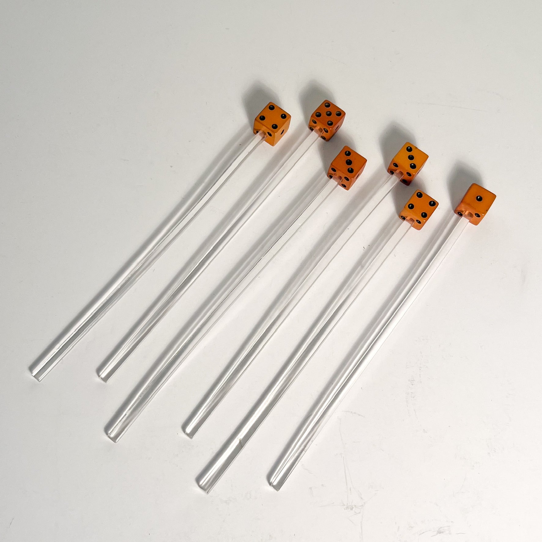 These vintage stir sticks are app. 8" long. The sticks are acrylic and the die are resin. Each stick has a different number on top to help tell whose drink is whose. Hand wash to keep them in good condition.