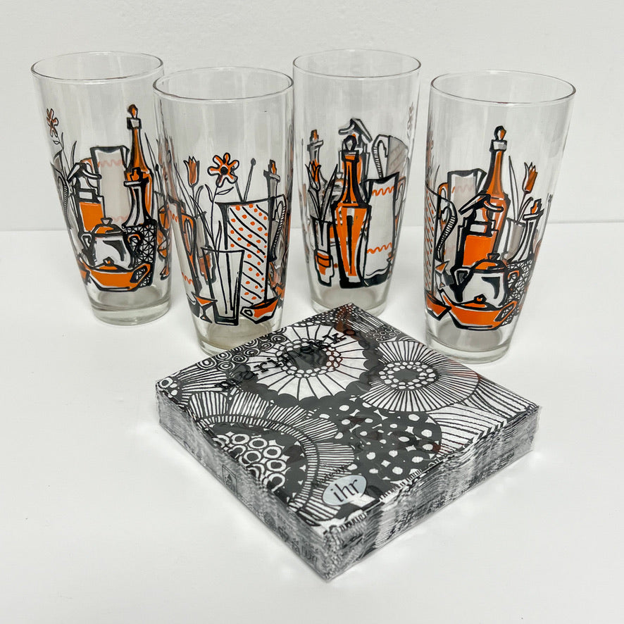 Midcentury decanters, pitchers, bottles and glasses in orange, white and black surround the sides of these four tumblers. Each glass is curved toward the top. App. 2 5/8" in diameter and 5 5/8" tall. Hand washing is recommended to preserve their beauty. Napkins in pic not included.