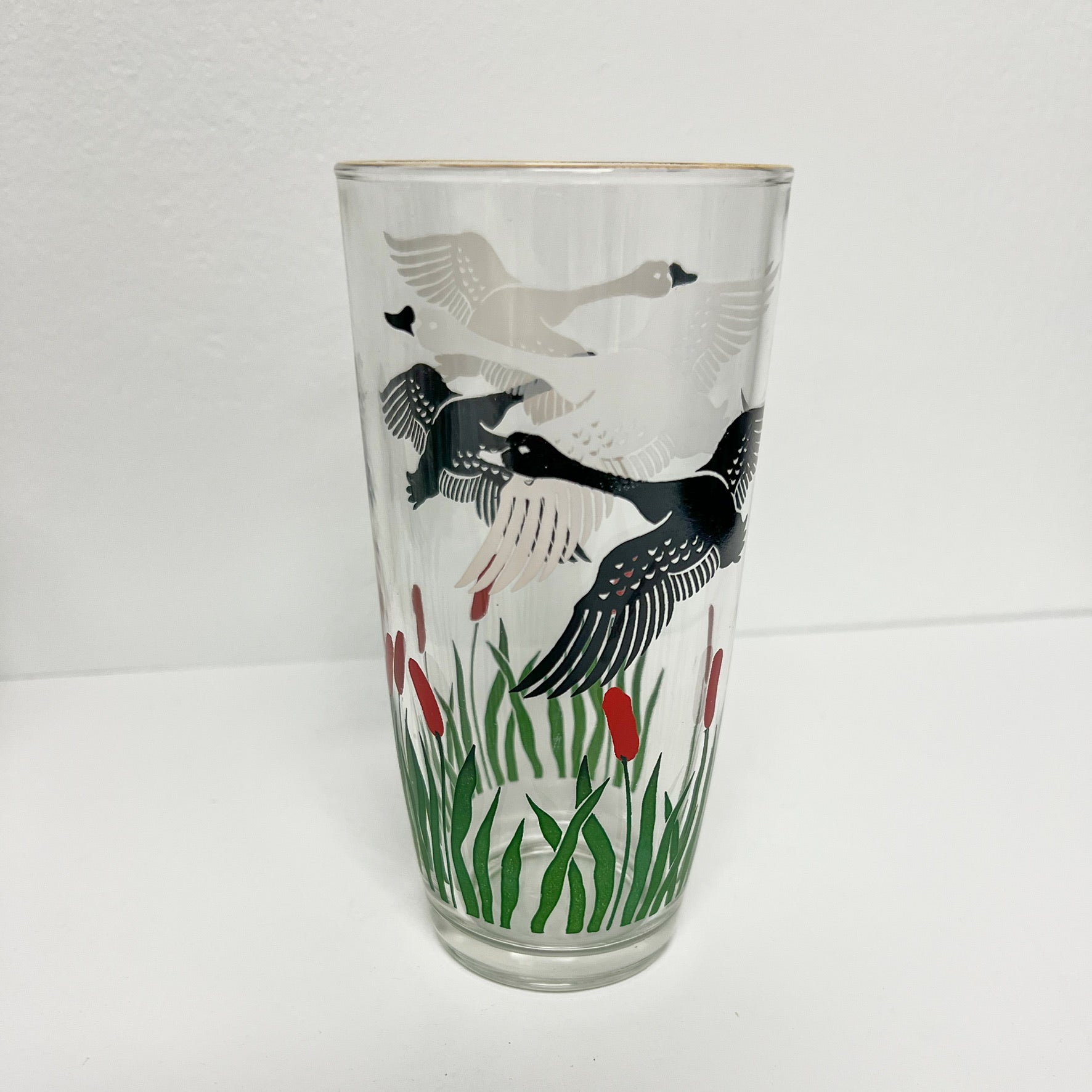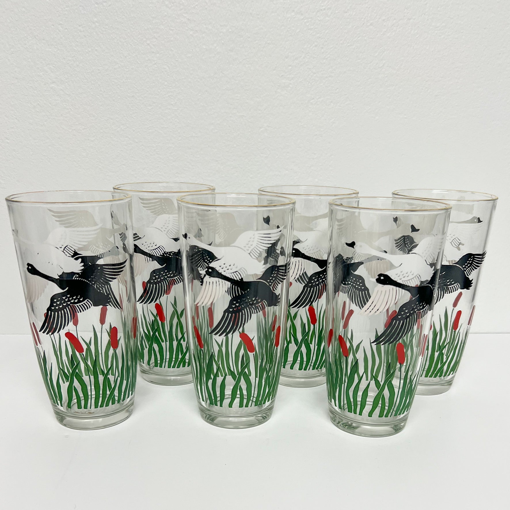 This set of six midcentury goose tumblers features black and white geese flying over bull rushes. Each glass has a gold rim. These are substantial tumblers, app. 6.5" tall and 3 1/8" in diameter. Hand washing is recommended to preserve their beauty.