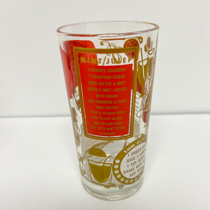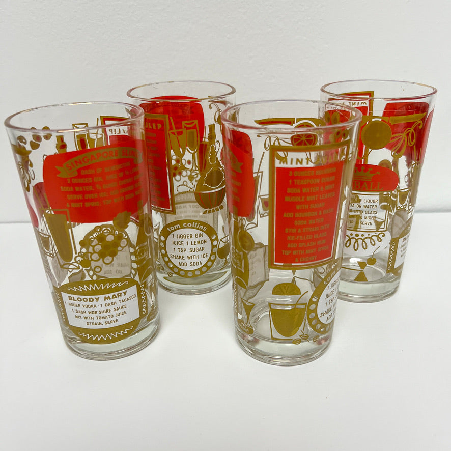 This set of four tumblers features cocktail recipes and pictures of micentury glassware around each glass. Tumblers are app. 5.25" tall and 2.75" in diameter. Some fading to gold rims. Please note the gold design is a gold color rather than a metallic gold. Please hand wash to protect the beauty of these tumblers.