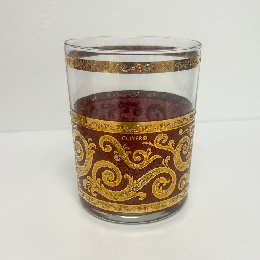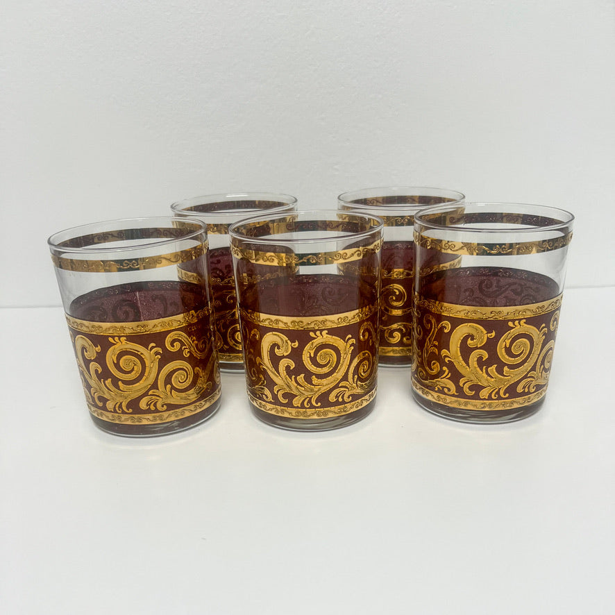 Swirls and scrolls band this set of five Culver old fashioneds. The background is a deep burgundy. Hand washing is recommended to preserve the beauty of this set.