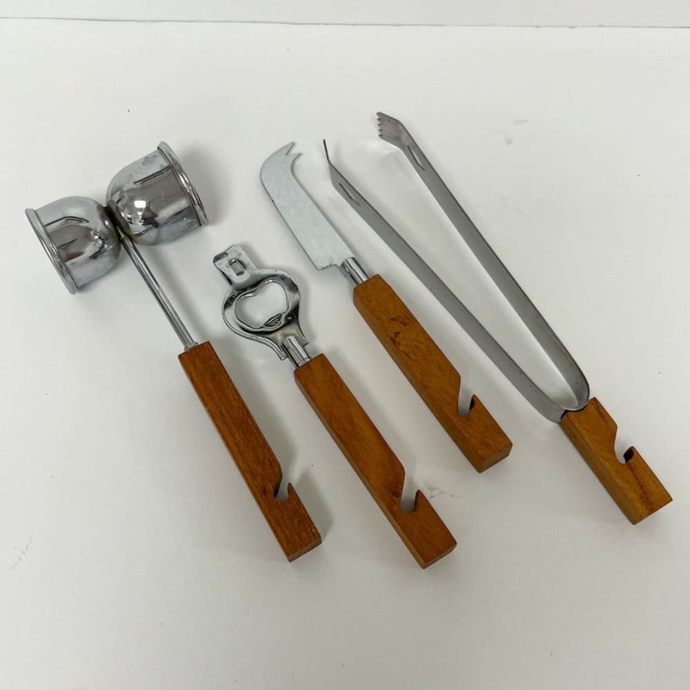 Signed Georges Briard on the bottom, this bar set likely dates to the 1970's. It features a jigger, bottle opener, bar knife, and tongs, all in useable condition. The notched handles allow them to suspend from the metal bar between two wooden posts. The rack with tools in place measures app. 9 7/8" tall, 5 7/8" deep, and 8.5" wide. Hand wash only.