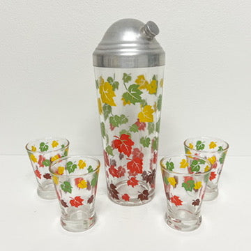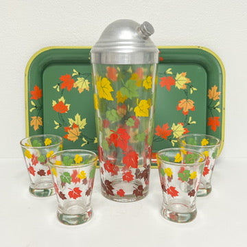 (23864) Colorful Leaves Shaker Set with Four Glasses and Coordinating Metal Tray