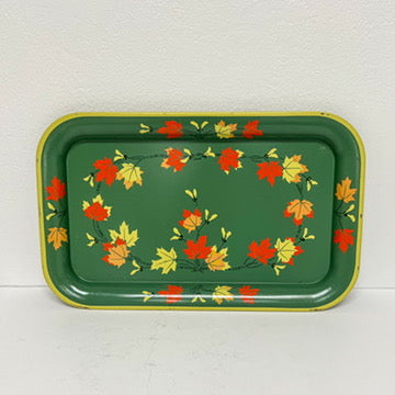 This leaf shaker with four small sipping glasses probably dates to the 1950's. Colors on the set are red, yellow, green, and brown. Each glass is app. 3 1/4" tall and 2 1/2" in diameter. Shaker is app. 8 1/4" tall without lid and 3 3/4" in diameter. Tray is 14 1/4" long and 8 3/4" wide. We are not sure the tray is original to the set, but we found them together and they look good together--so we are keeping them together! Some wear to tray, mainly on the back (last pic.) Hand washing is recommended to preserve the beauty of this cocktail set.