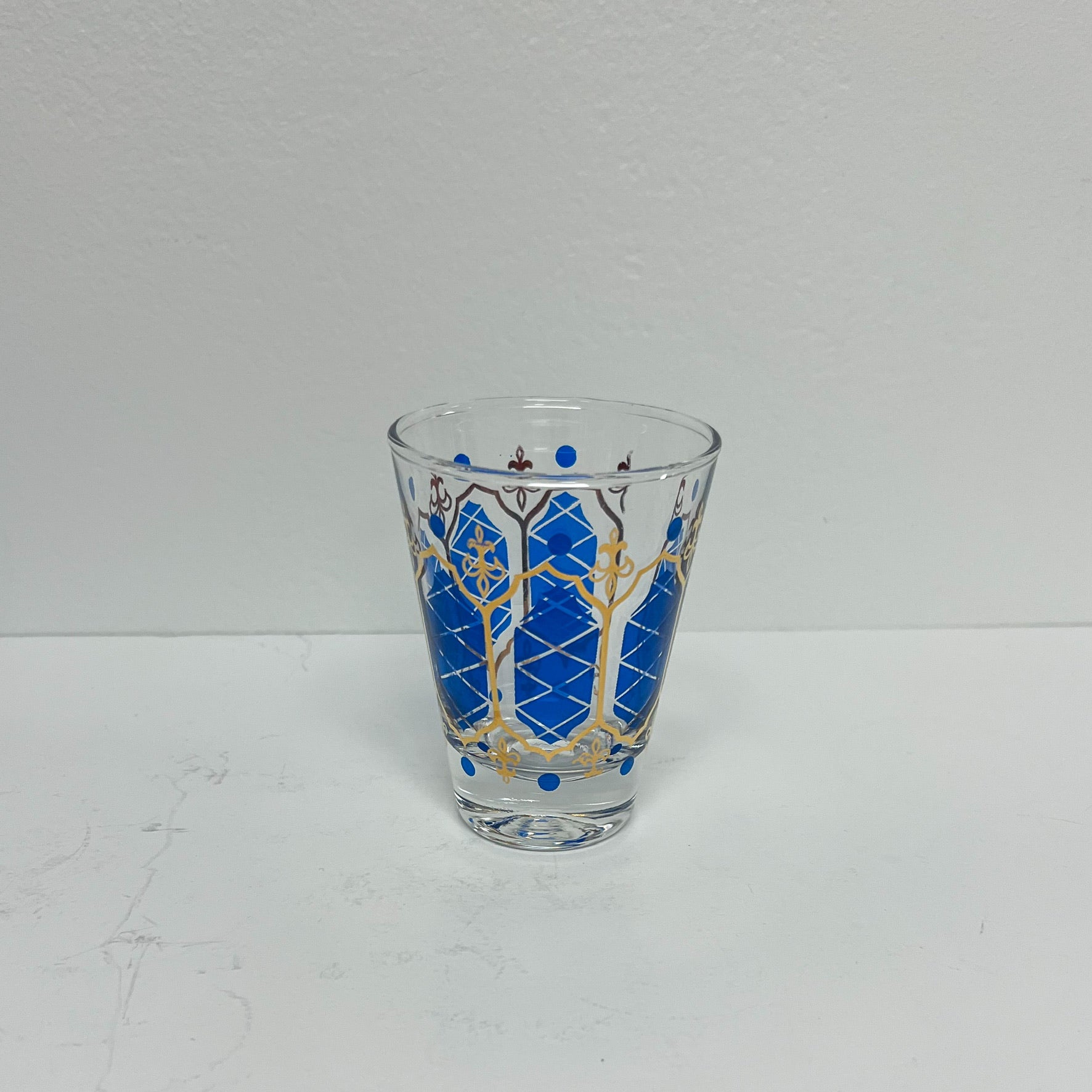 These midcentury glasses are a smaller size (but larger than a shot glass) that fits comfortably in your hand--perfect for sipping whiskey or scotch. Each glass is app. 3.5" tall and just under 2.75" in diameter. The design is a brilliant blue with bright gold scrolls. Hand washing is recommended to preserve the beauty of these glasses
