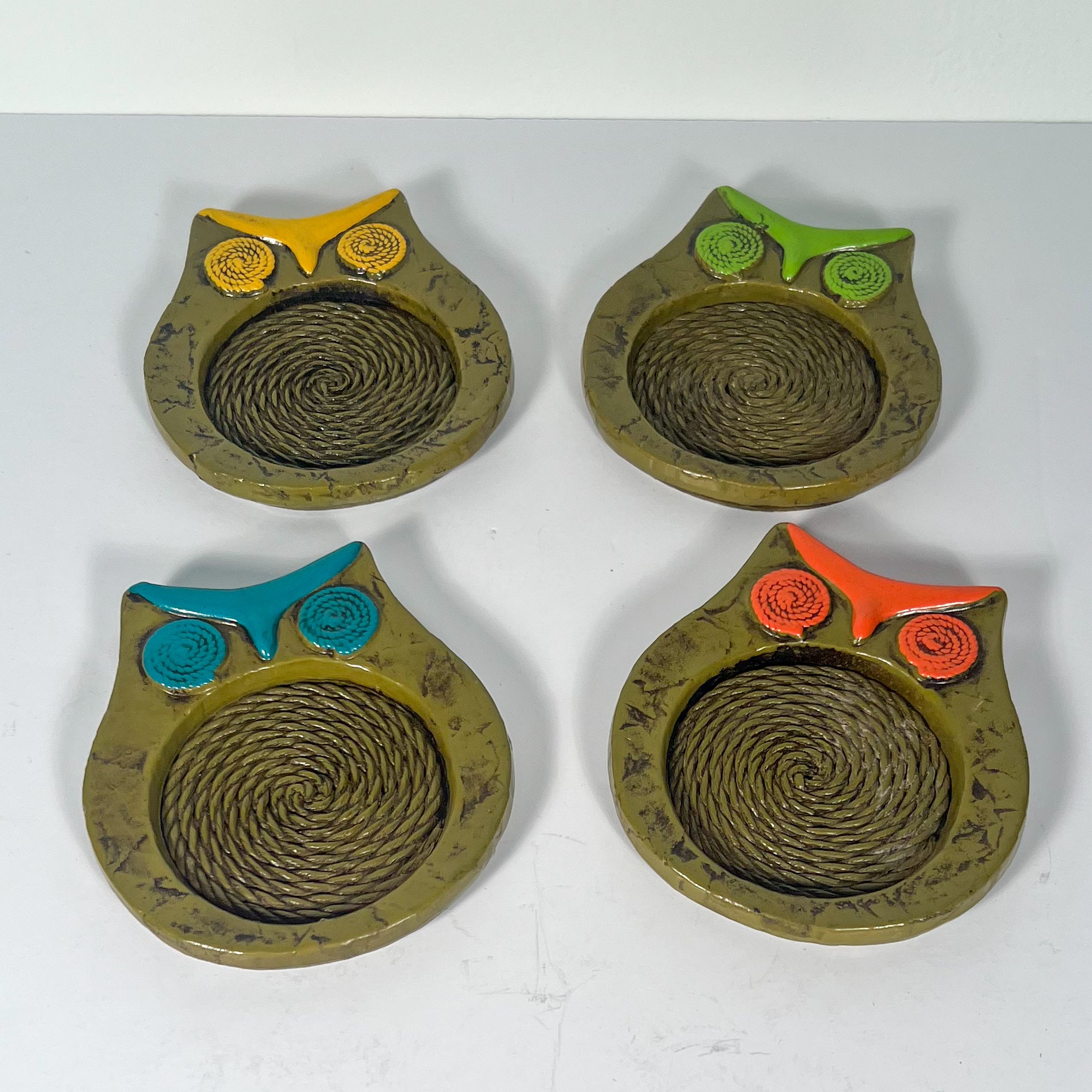 This set of four owl coasters oozes midcentury charm in all the classic period colors. Each coaster is app. 5" tall and 4.5" wide. Signed "FF" and produced by Fitz and Floyd.