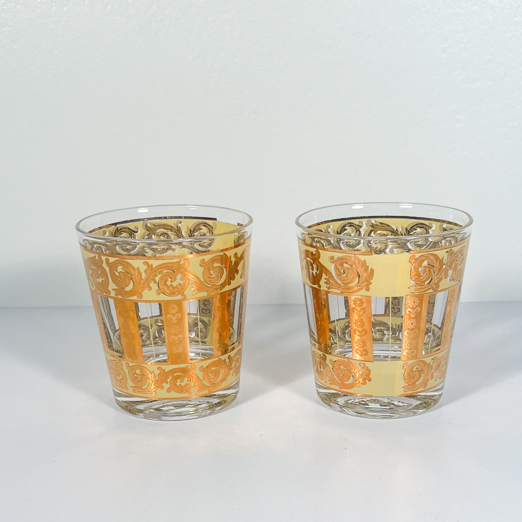 This set of seven glasses are the perfect size for sipping whiskey or scotch! Each glass is app. 3 3/8" tall and 3" in diameter. The design is a bright gold scroll on stripes with a pale creamy yellow background. Each glass has a seam where the design was wrapped around the glass, and this is not a flaw, as it was intended by the maker. Light wear to gold rims does not detract from the look. Hand washing is recommended to maintain their beauty.