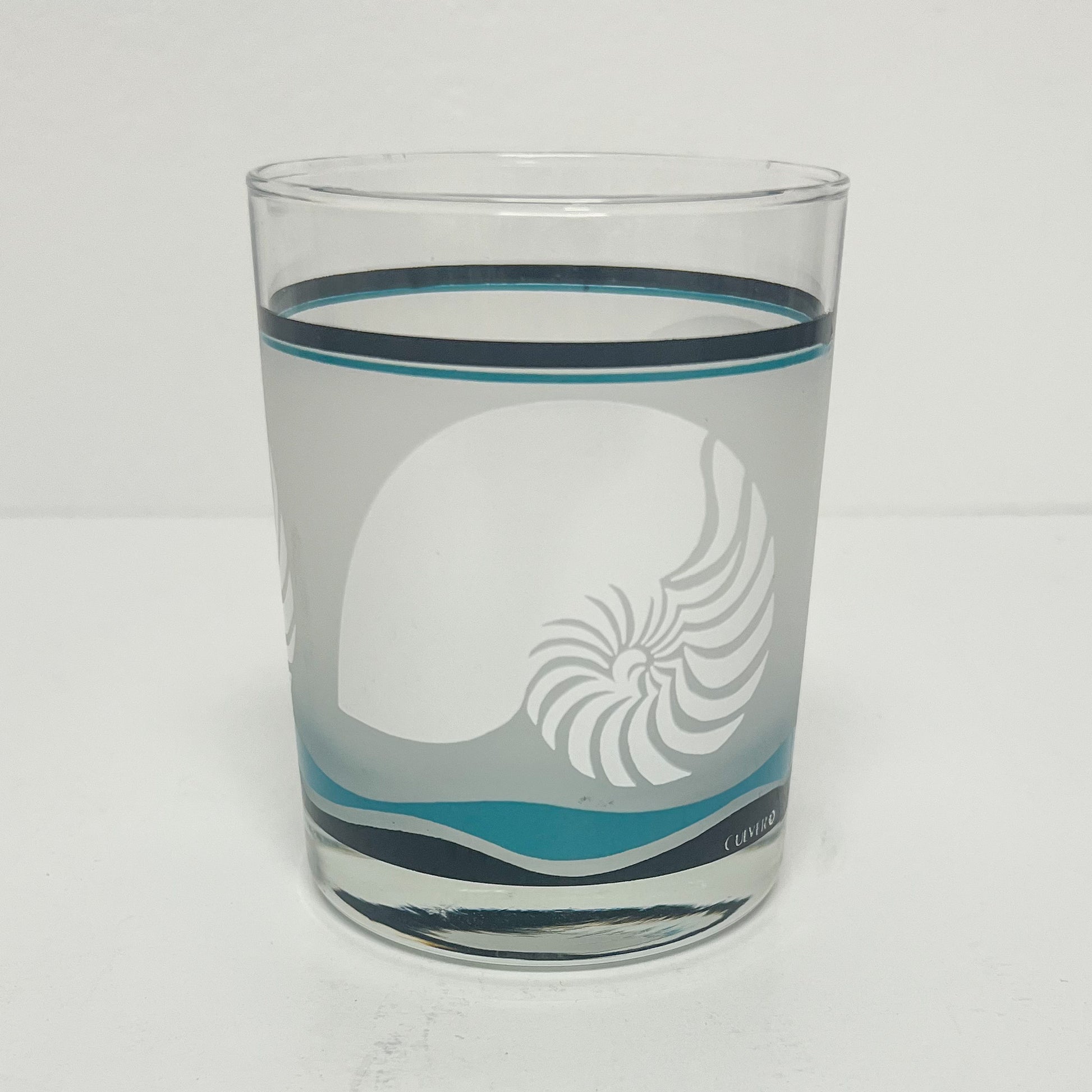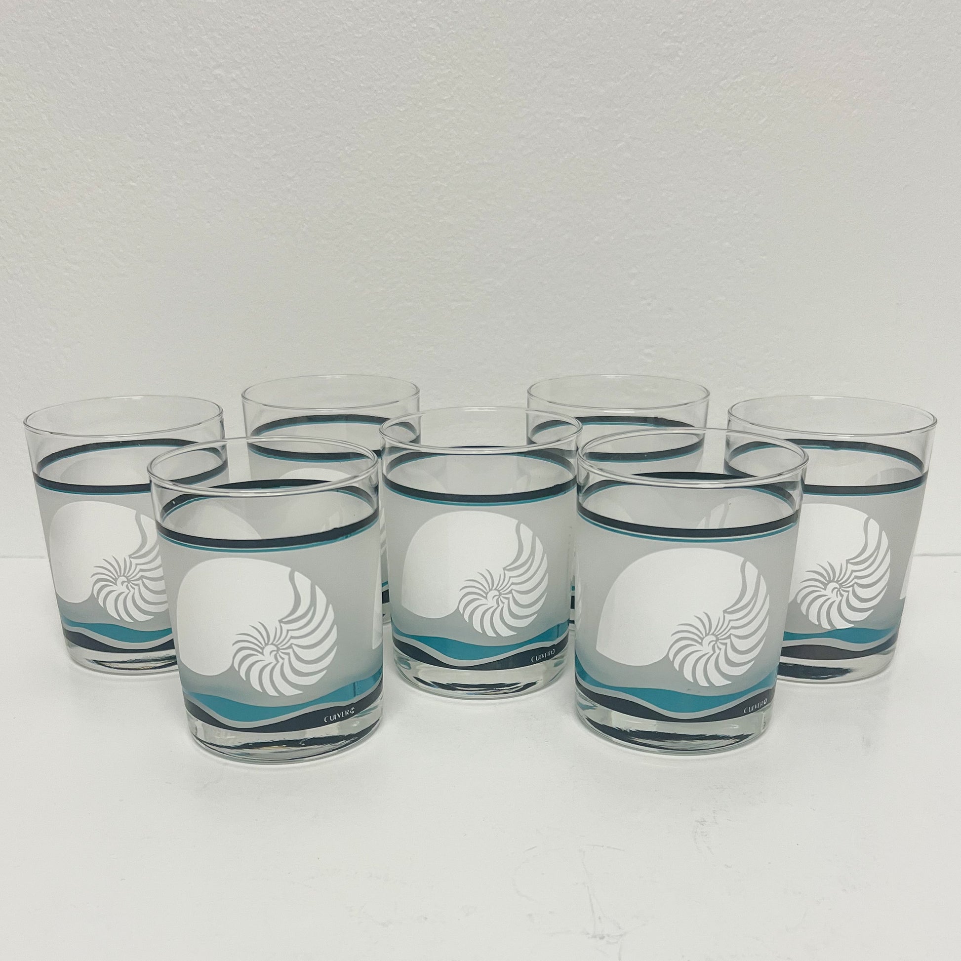 This set of seven Culver Nautilus Old Fashioneds features shades of teal and black. It likely dates to the 1980's. Each glass is app. 4 1/8" tall and 3 1/4" in diameter. Hand washing is recommended to maintain the beauty of these glasses.