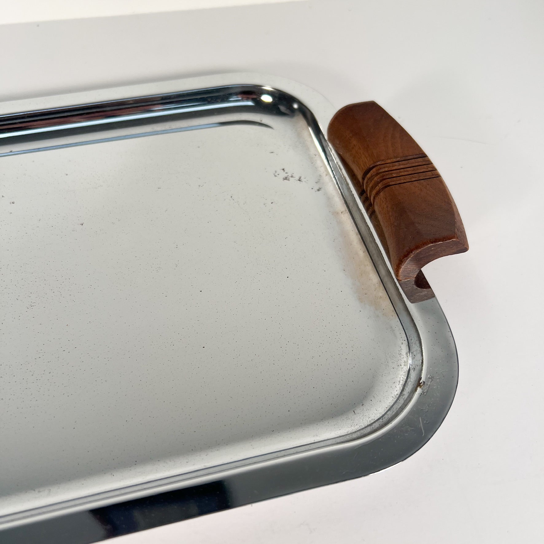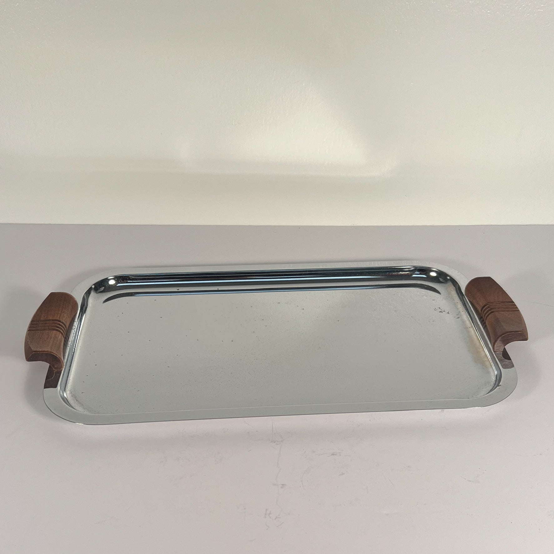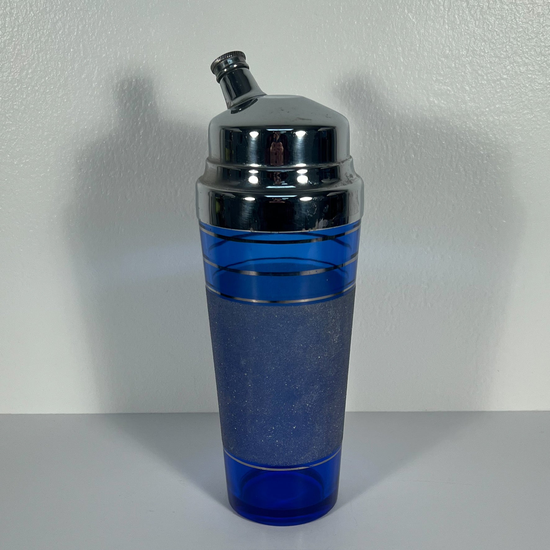 This is a period art deco cocktail set with cobalt blue glass and silver trim. The trim is bright, though difficult to show in pics. Shaker is app. 10" tall with lid. Some wear to metal lid. Each footed glass is app. 4 1/8" tall and 2" in diameter. The wood handled tray is app. 16.75" long (including handles) and 8 7/8" deep. Light wear to the tray and a few small spots of oxidation to the metal. (See last pic.) This could possibly be polished out by the new owner, but we are leaving it as is. Hand washing is recommended to preserve the beauty of this set.