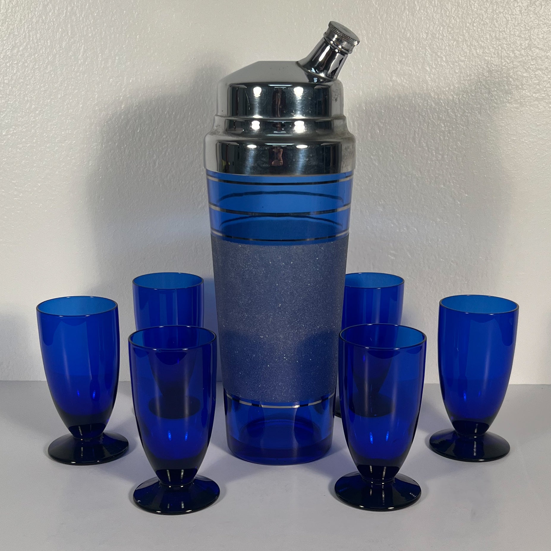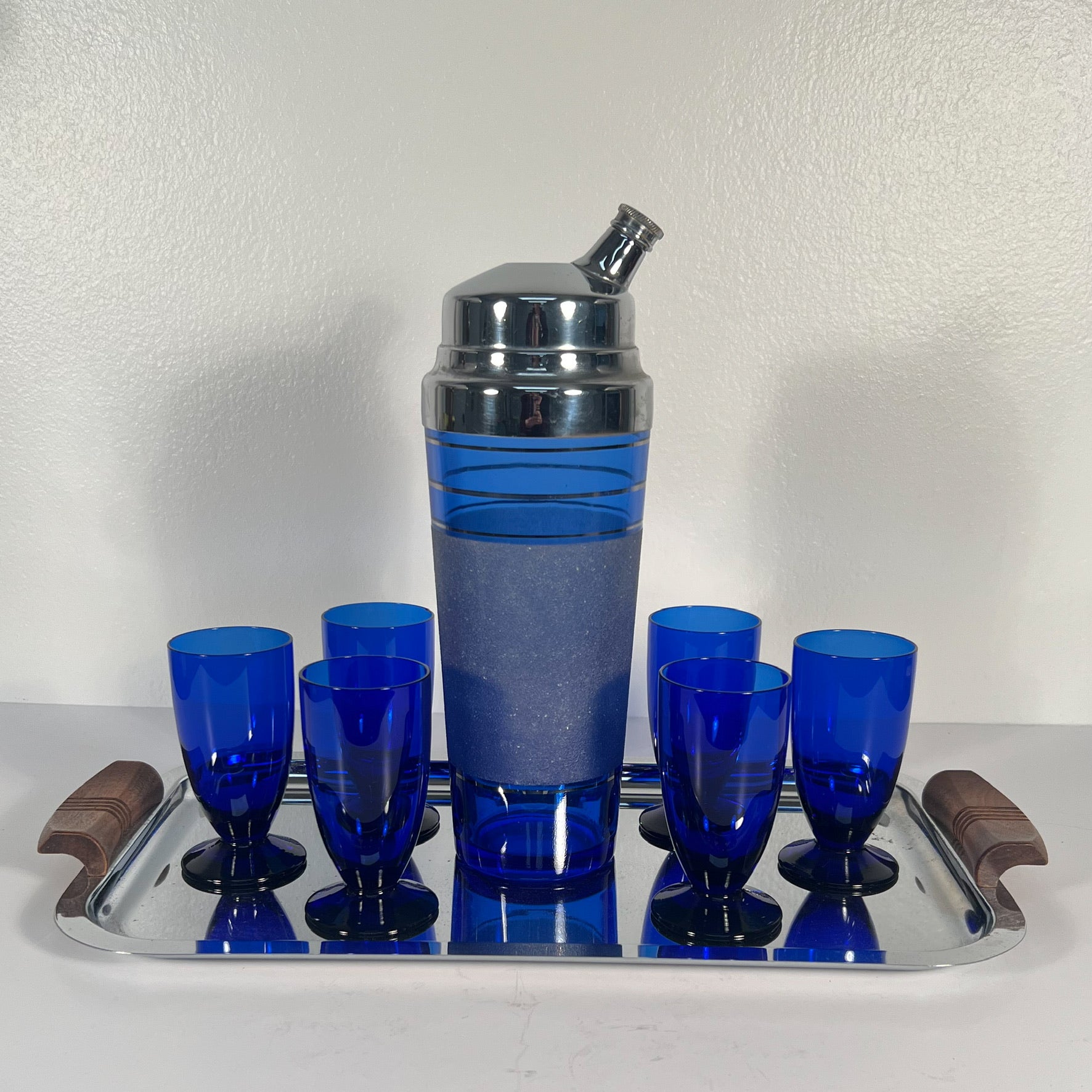 (24812) Cobalt Art Deco Shaker, Tray and Six Footed Glasses