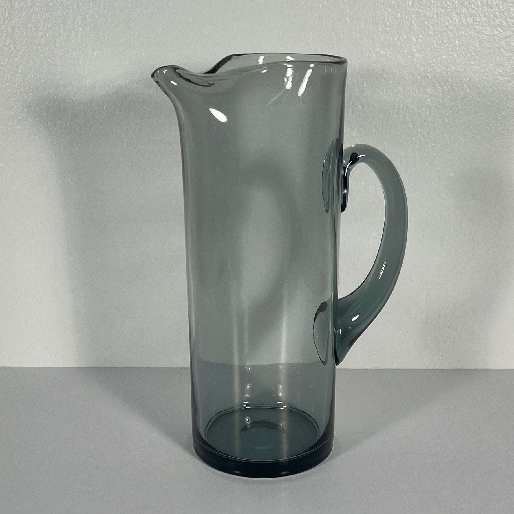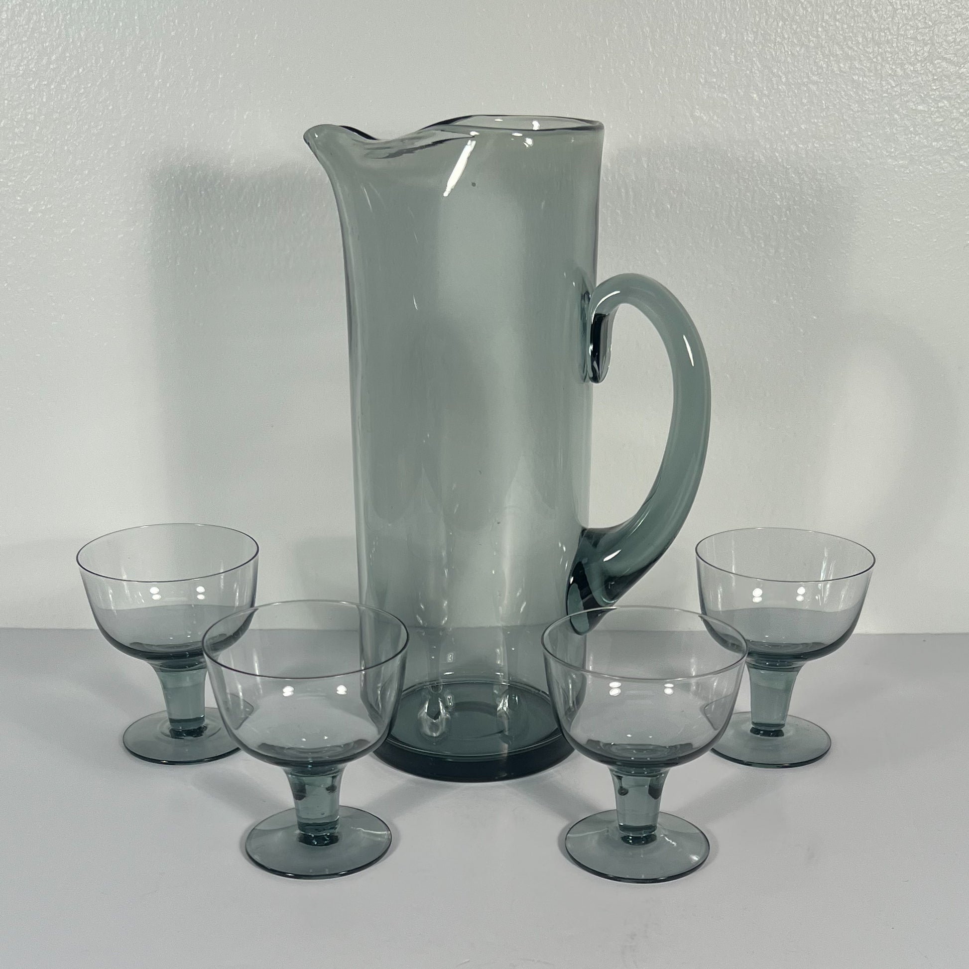 This midcentury cocktail set oozes smoky gray elegance and classic lines. The pitcher is app. 6.25" wide with handle and 9.75" tall. Each of the four footed glasses is app. 3 3/8" tall and 2 13/16" in diameter. Hand washing is recommended to maintain the beauty of this set.