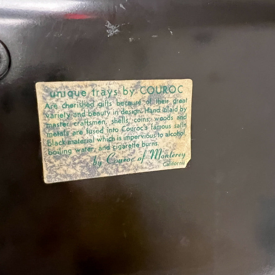 Feel the beatnik vibe! Vintage Couroc tray with maracas and bongo drums, and the hands playing them. As indicated by the sticker, this is an earlier Couroc tray. Minor scratches and scuffs commensurate with age, but no chips or cracks. App. 10.75" wide x 15.5" long. Hand washing with mild soap is recommended to preserve this tray's beauty.