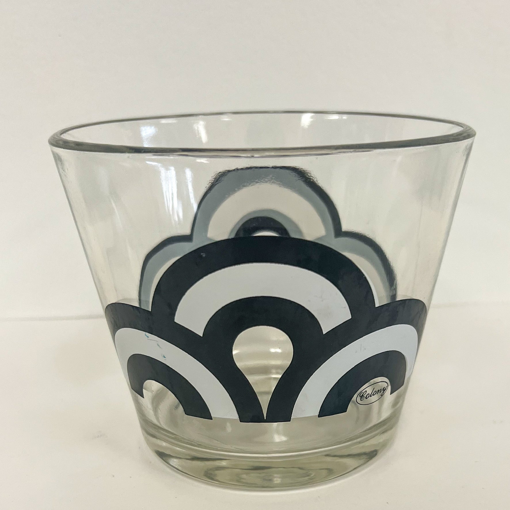 This glass ice bucket made by Colony, ca. 1970's, features a gold black and white design, and is signed by the maker. Handwashing is recommended to preserve its beauty.